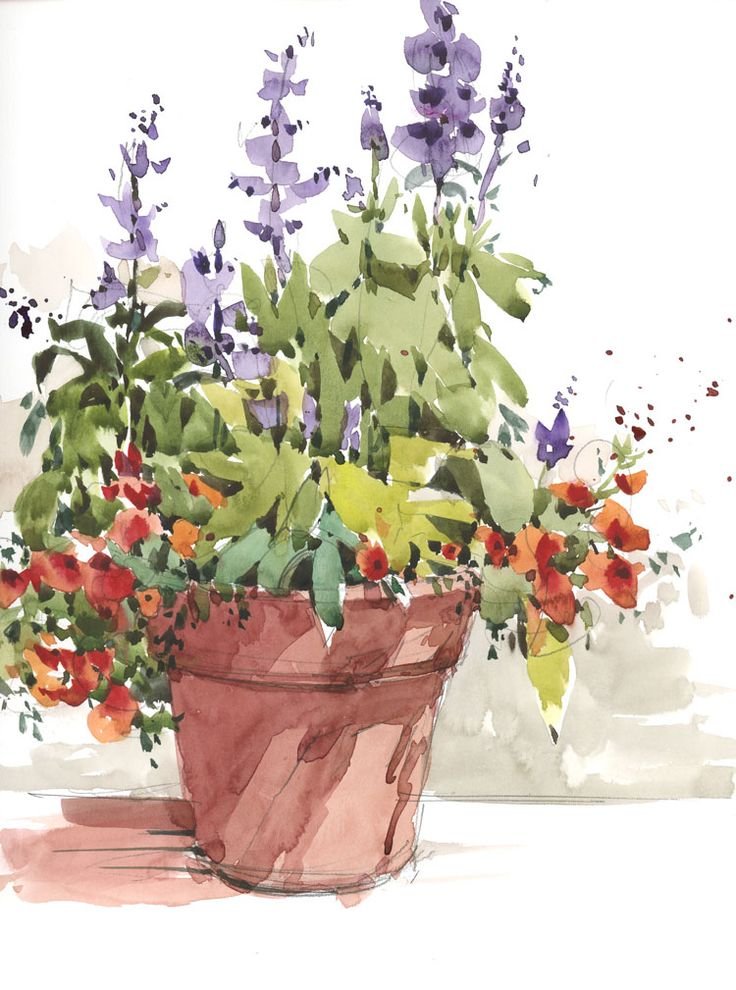 Цветы акварелью этюды в горшке