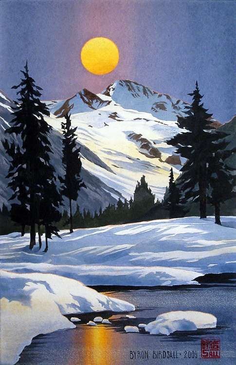![Снежные горы небо акварель]()