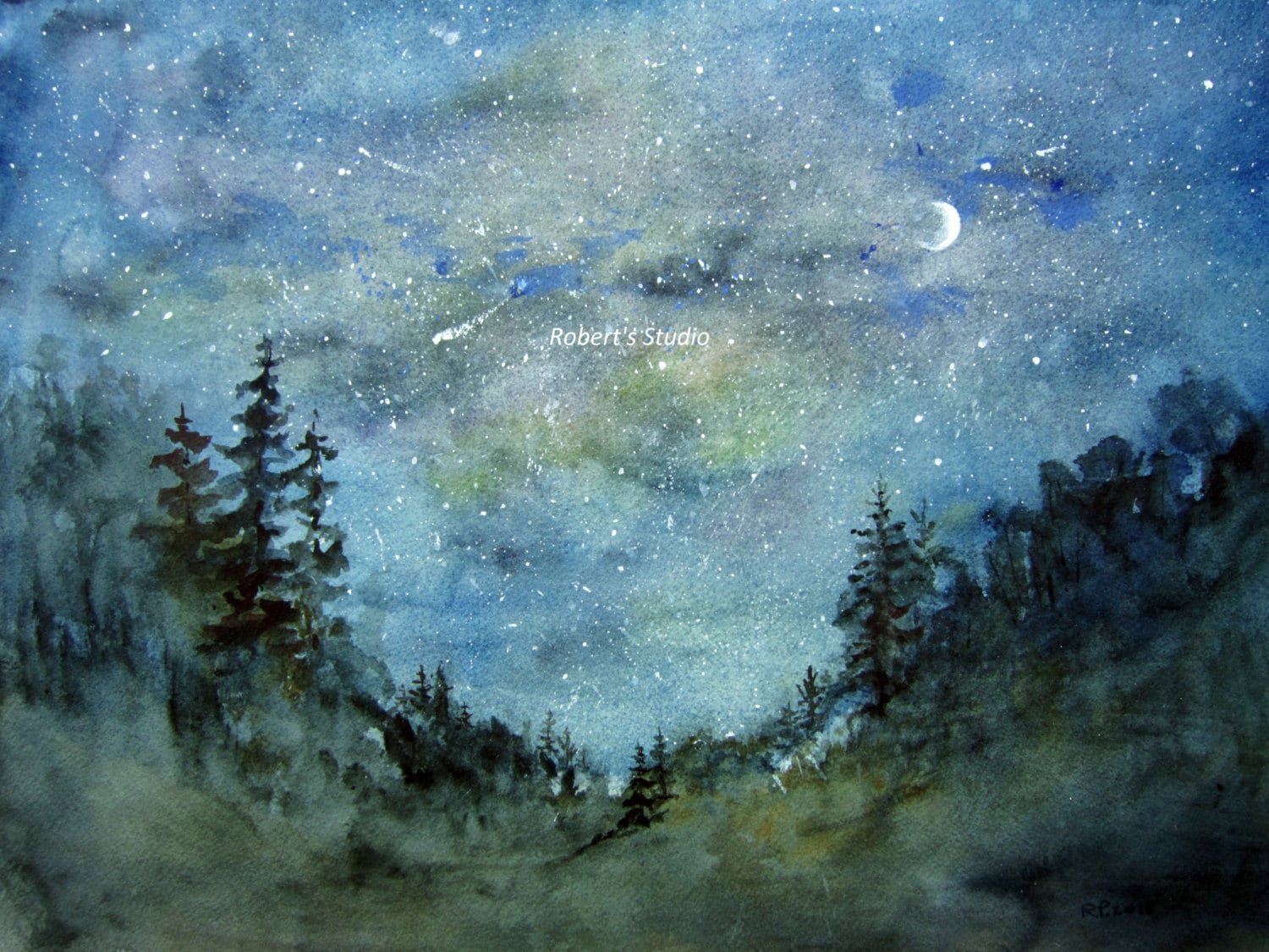 Ночной пейзаж акварелью