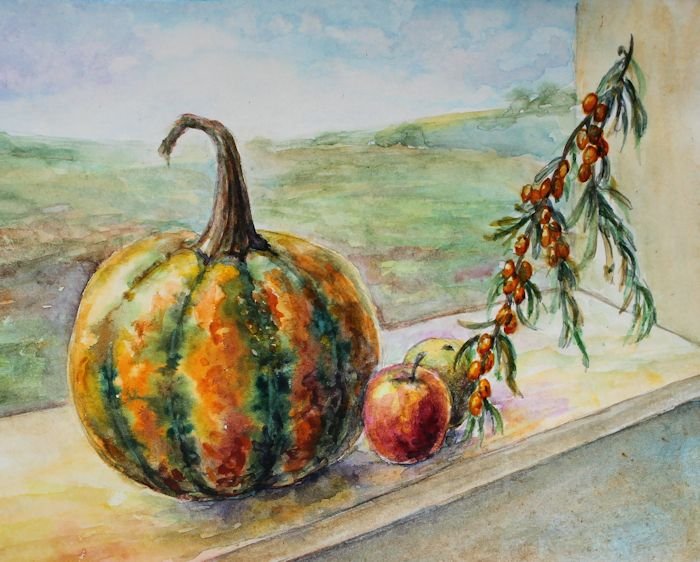 ![Натюрморт с тыквой акварель]()