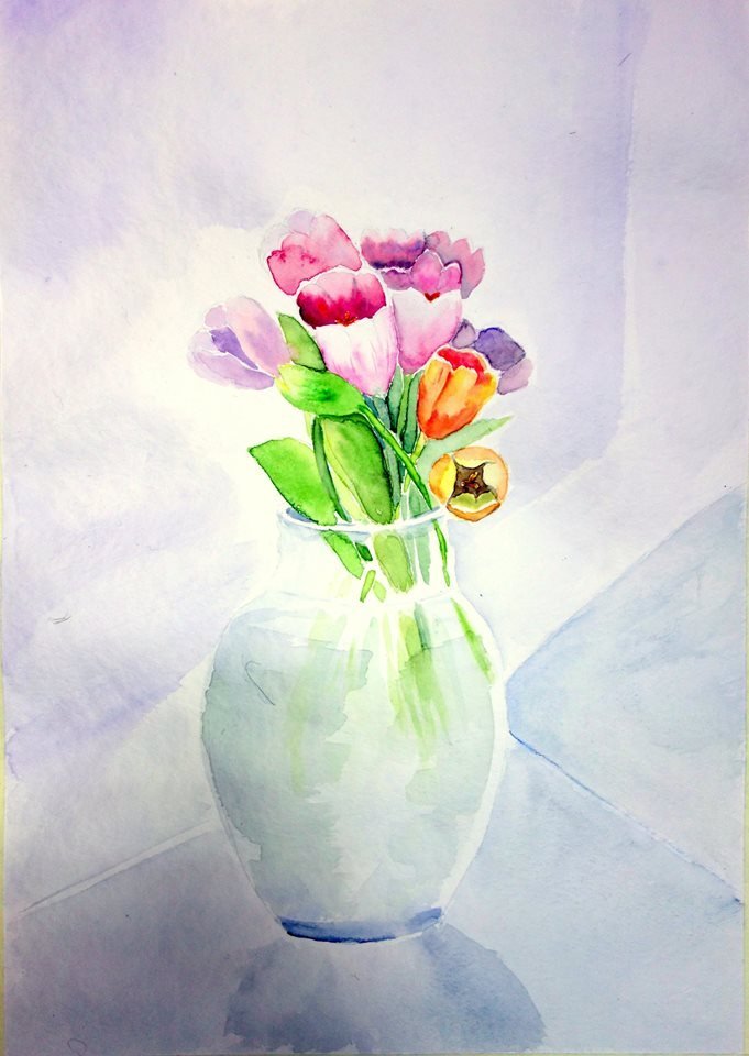 ![Тюльпаны в стеклянной вазе акварель]()