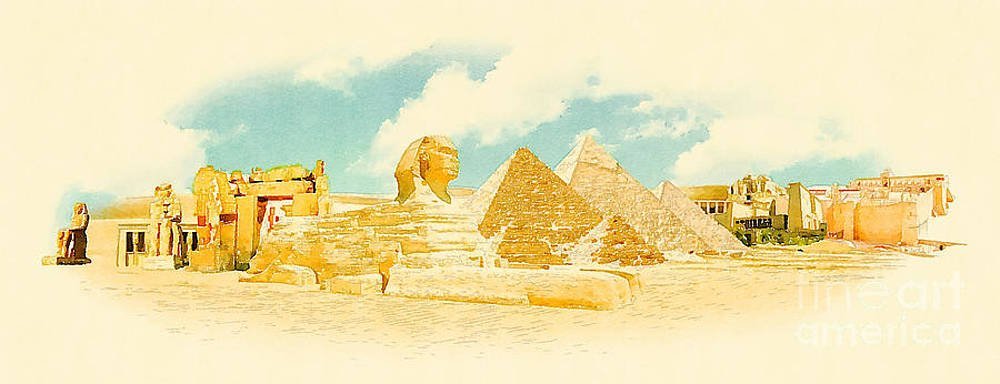 ![Пирамида Хеопса и сфинкс в акварели]()