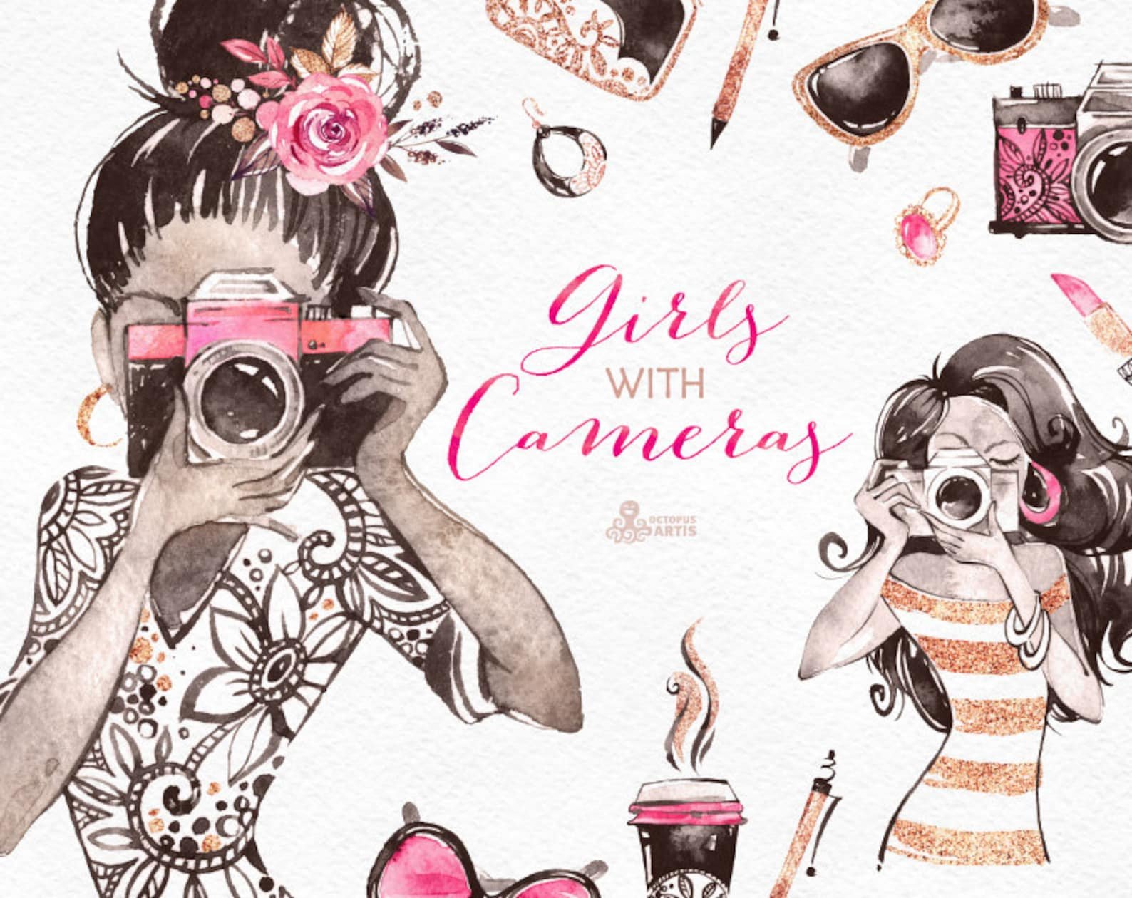 ![Девушка фотограф акварель]()