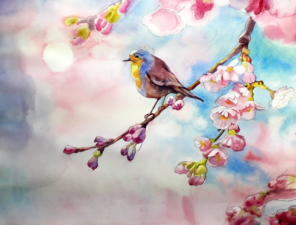 Птичка на цветущей ветке акварелью