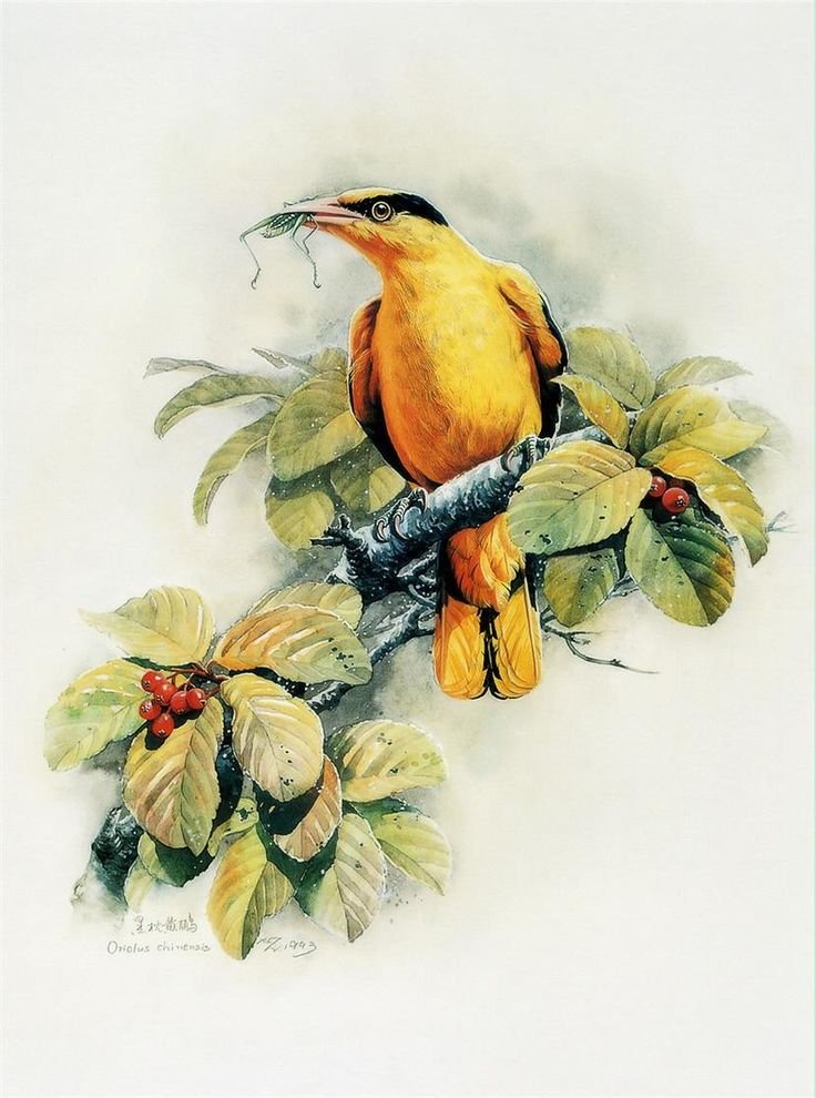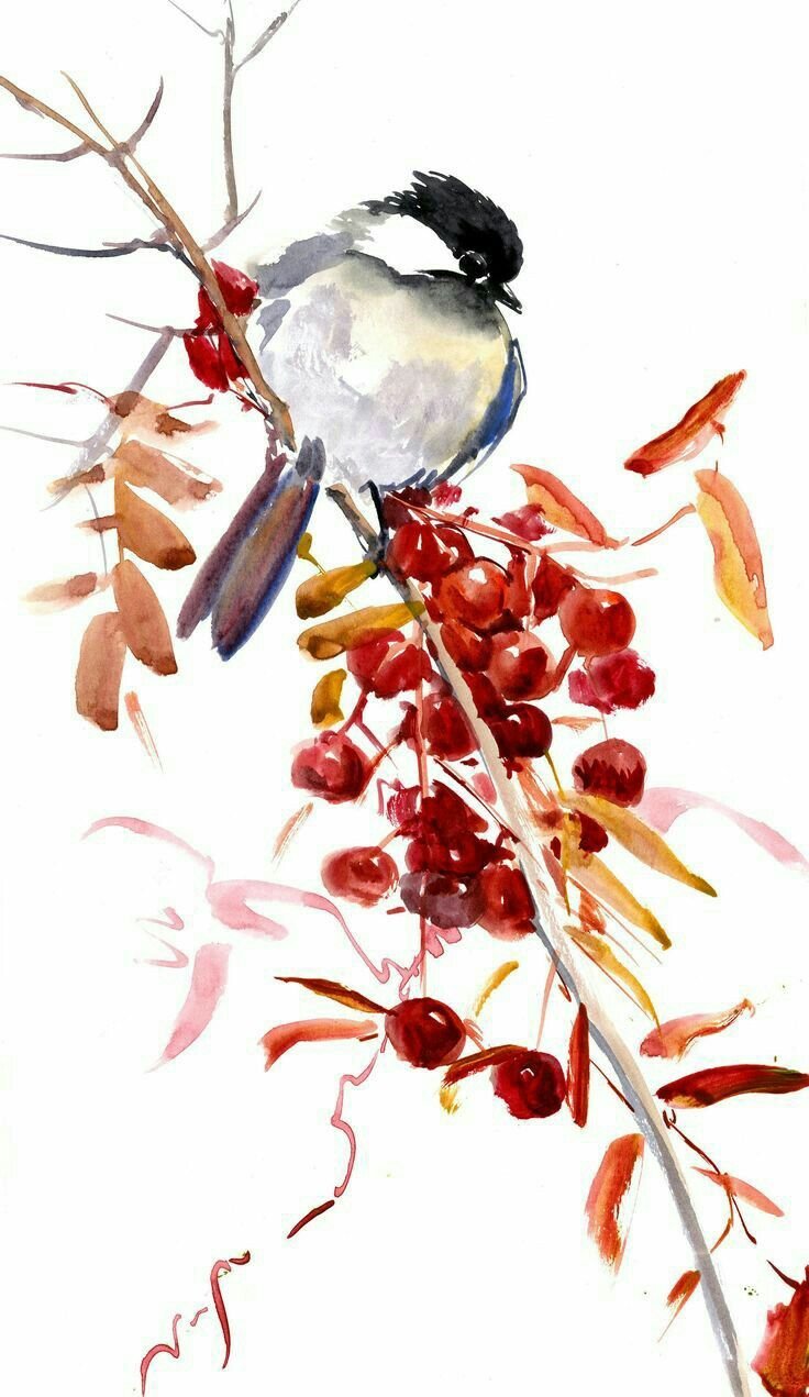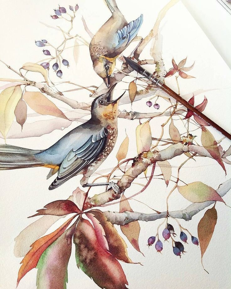 ![Птицы на ветке акварель живопись]()