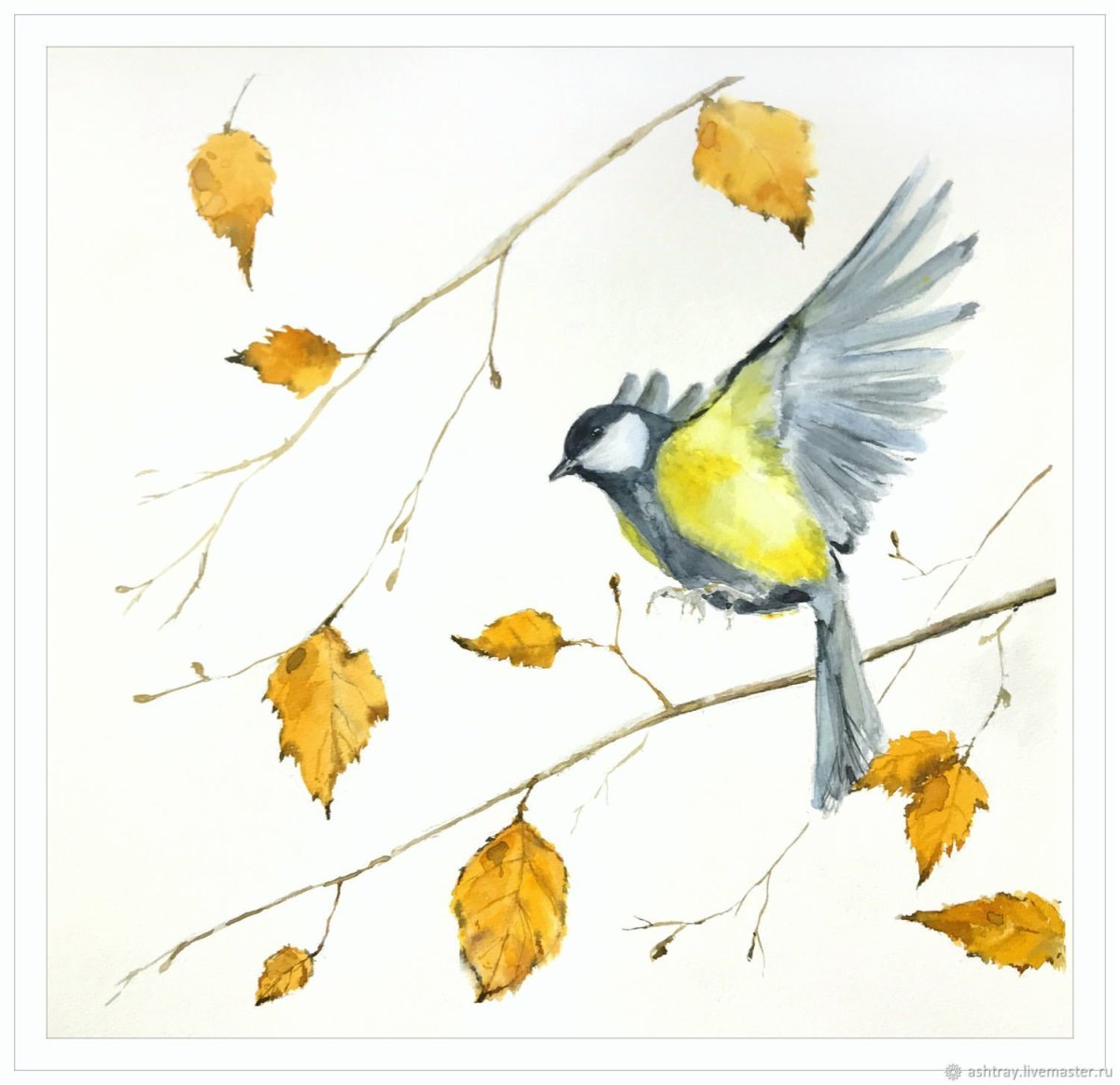 ![Синица на ветке акварель]()
