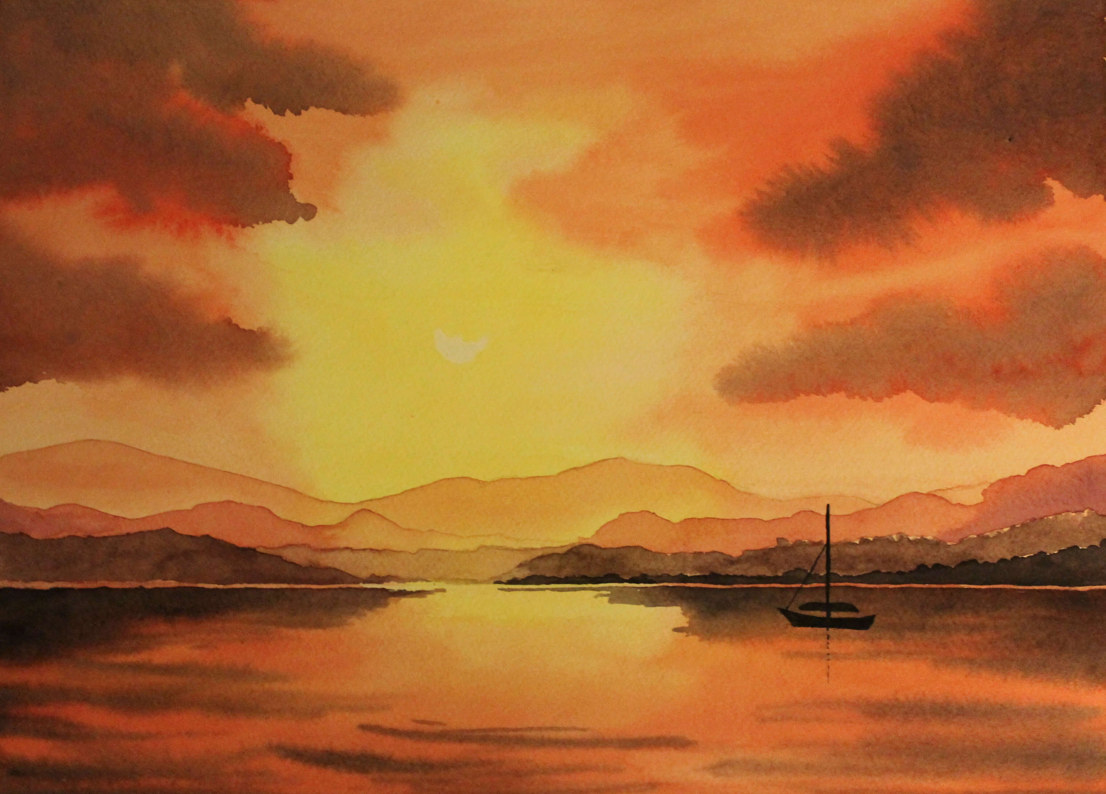 Закат рисунок акварелью