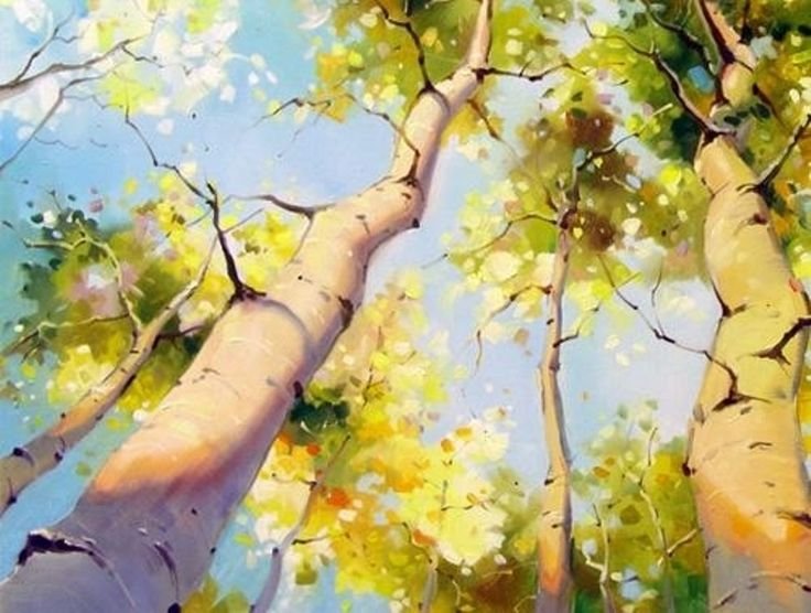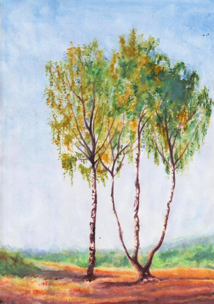 ![Пейзаж с березами гуашью]()