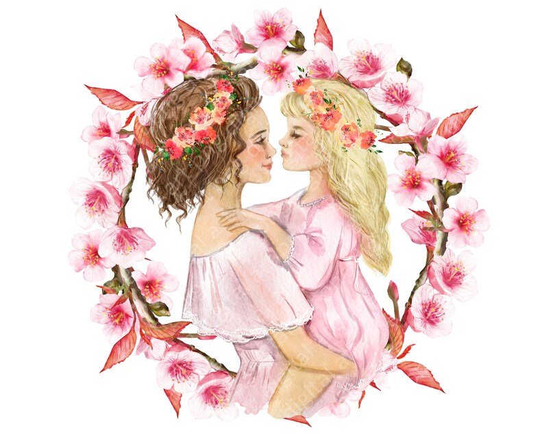 ![Мама и дочь акварель]()