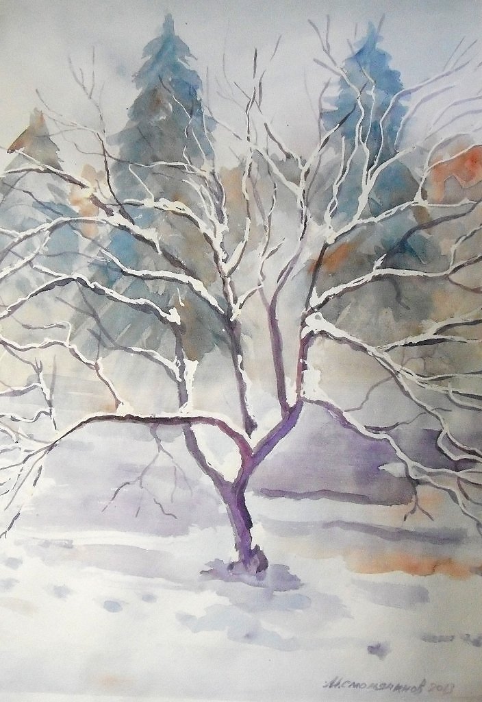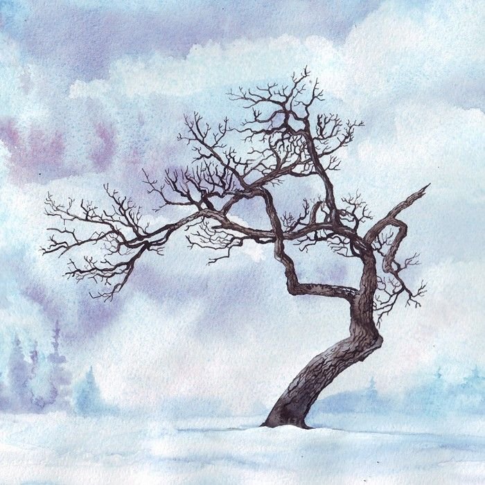 Зимнее дерево акварелью
