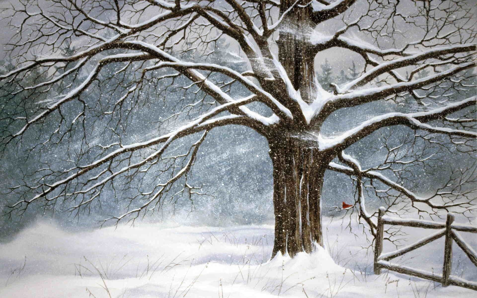 Гуашь дерево в снегу