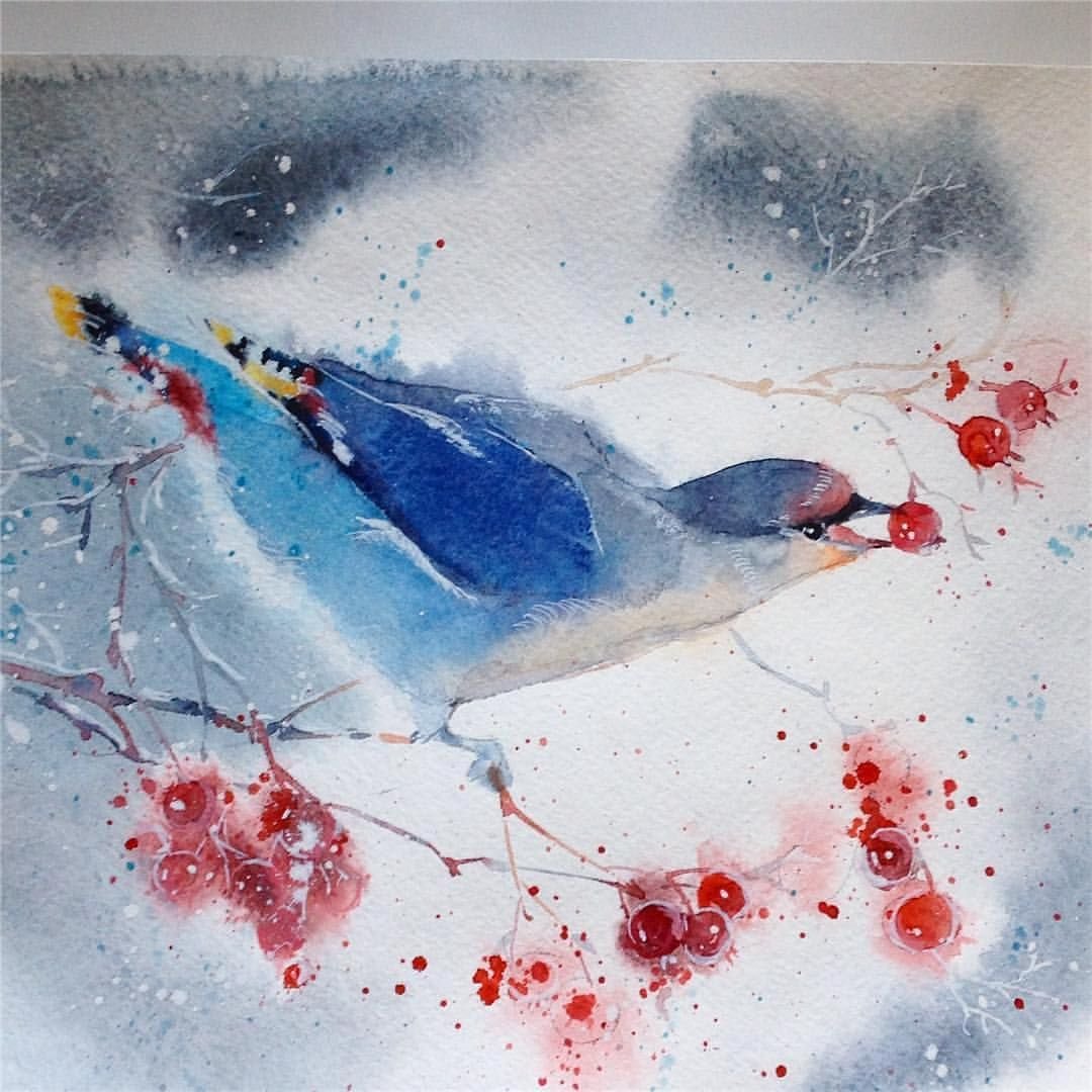 ![Зимние птицы акварелью]()