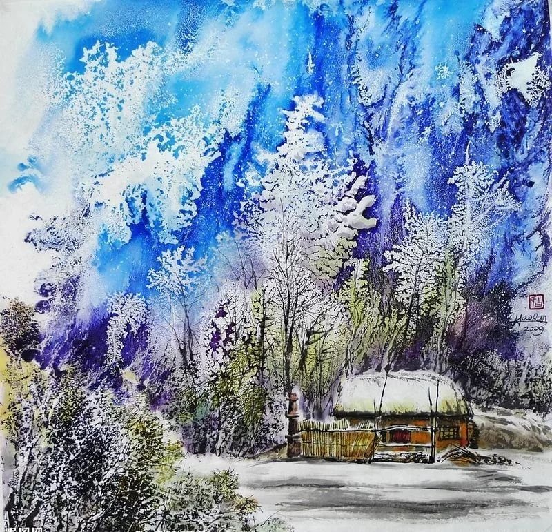![Зимний пейзаж с домиком акварелью]()