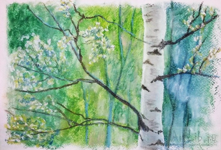 ![Береза пастельными карандашами]()