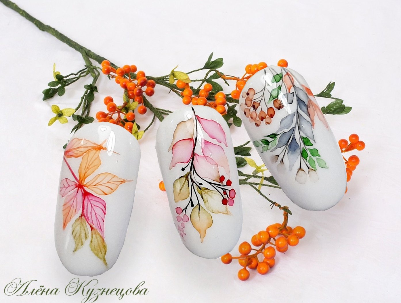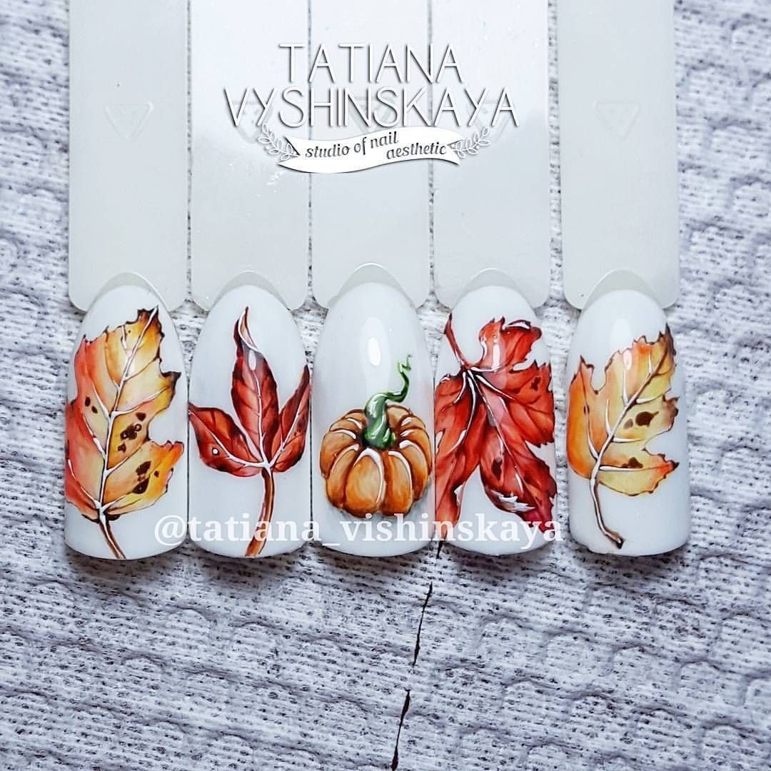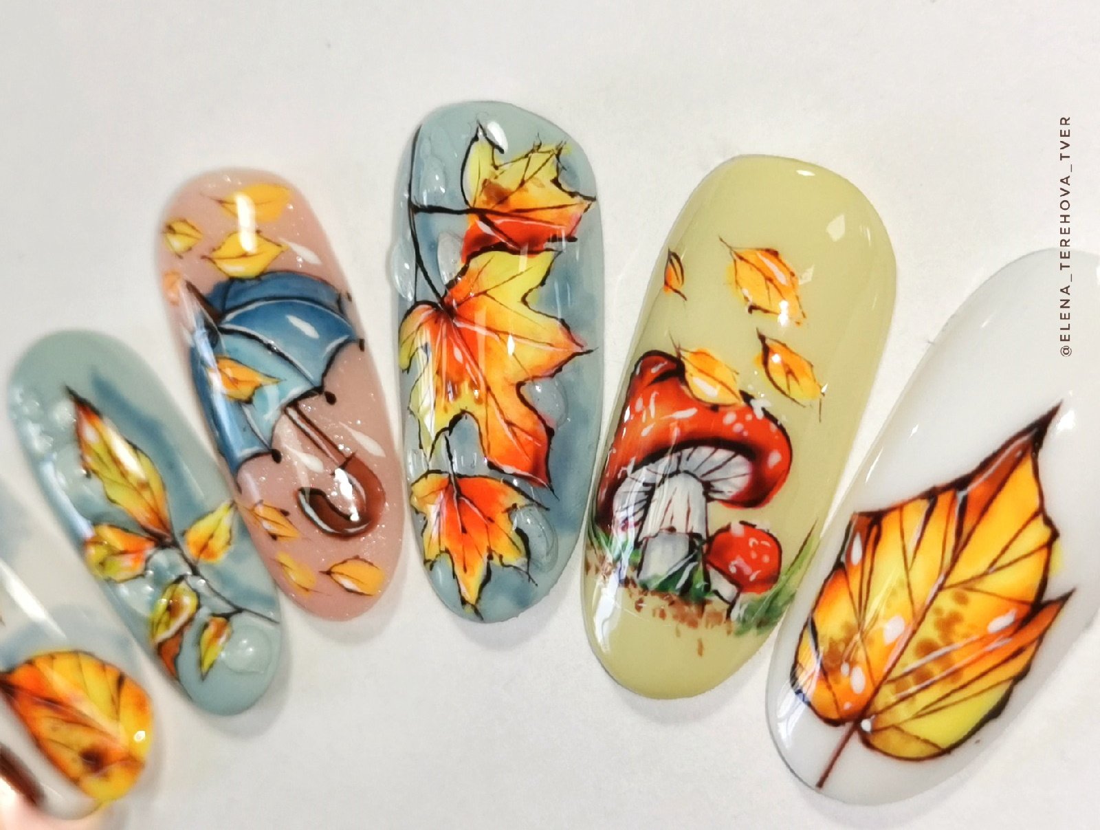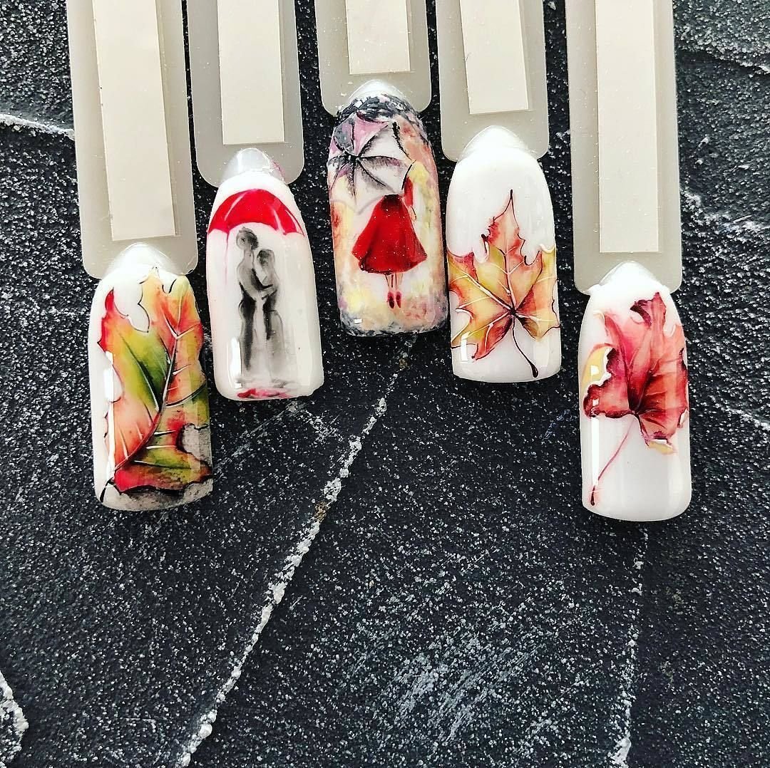 Рисунки на ногтях акварелью в осенней тематике позволяют создать неповторимый и стильный образ. Они отличаются своей нежностью и легкостью выполнения, что делает их очень популярными среди любителей маникюра. В осенних рисунках акварелью часто используются яркие оттенки желтого, оранжевого и коричневого цветов, а также различные элементы природы, такие как листья, шишки или птицы. Такой маникюр подчеркнет вашу индивидуальность и придаст ногтям оригинальности и элегантности. Также можно использовать акварельные краски для создания декоративных узоров, полосок или абстрактных элементов. Результат будет впечатляющим и сделает ваш образ стильным и модным.