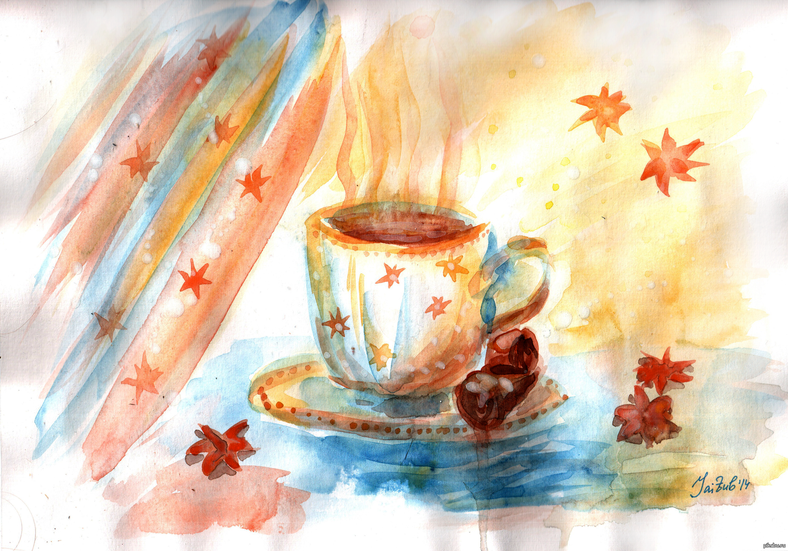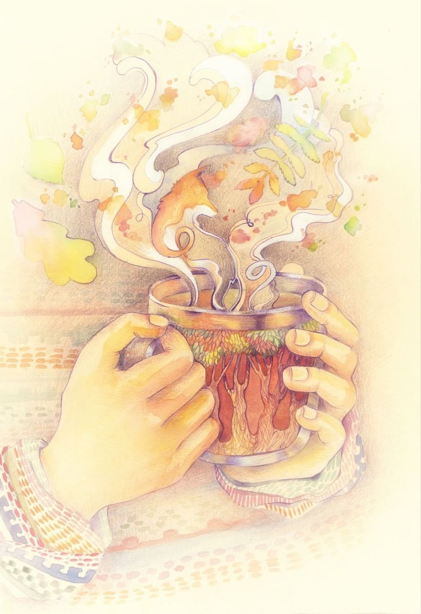 ![Акварель осень и чай]()
