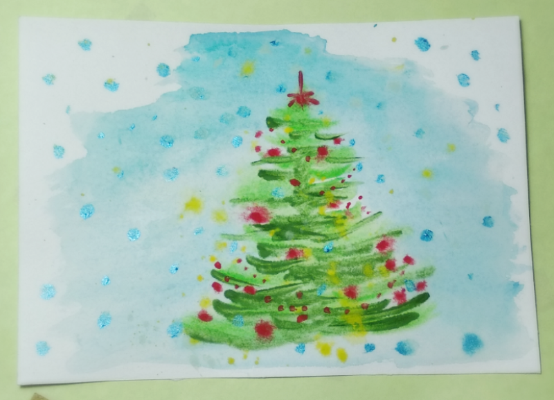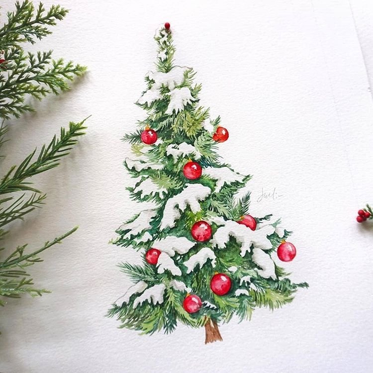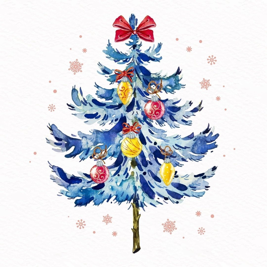 Великолепный рисунок новогодней елки, выполненный с использованием акварельных красок. Каждая ветвь дерева проникнута праздничным настроением и окутана нежными тонами зелени. Золотистые и серебристые шарики украшают елку, придавая ей блеск и элегантность. В каждой игрушке можно разглядеть отражение света и оттенки других цветов, создающих игривую игру на хвоях. Разноцветные огоньки гирлянды переплетаются между ветвями, создавая загадочное сияние и привлекая взгляды. Новогодняя елка на этом рисунке наполняет сердца радостью и желанием встретить праздник в окружении близких людей.