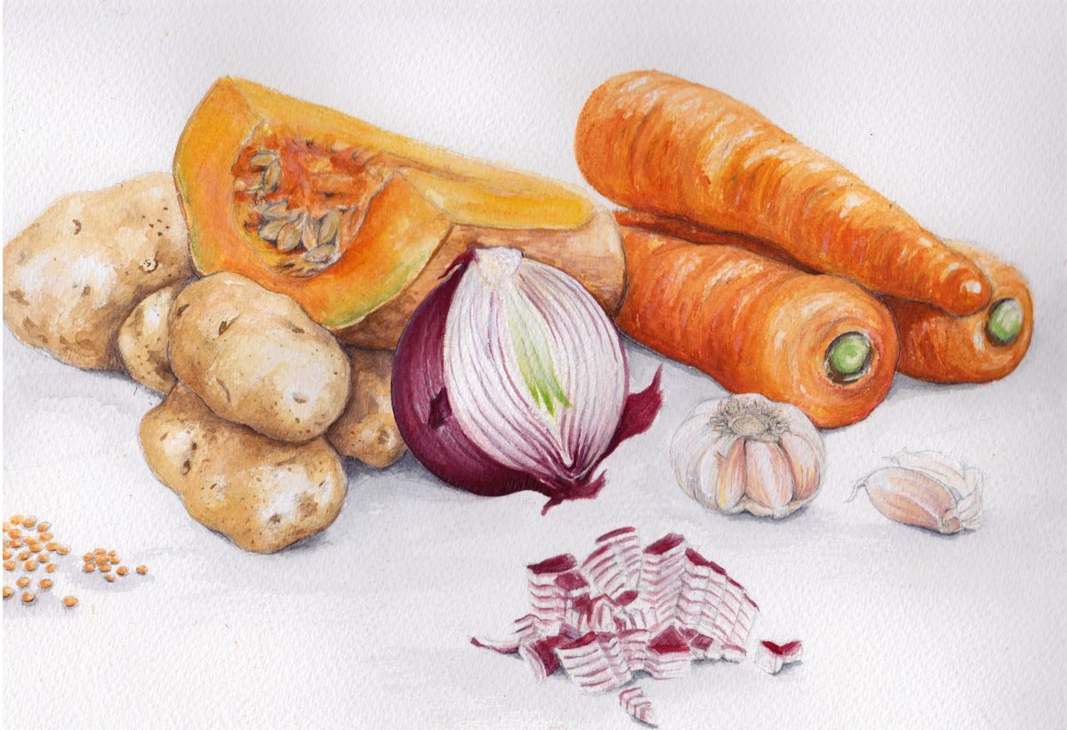 Описывая рисунок овощей акварелью, можно представить яркую и живописную картину, полную сочных цветов и деталей. На белом холсте располагаются разнообразные овощи: красные помидоры, зеленые огурцы, желтые перцы, фиолетовые баклажаны и множество других. Каждый овощ имеет свою форму, текстуру и оттенок, который художник передает с помощью акварельных красок. Легкие и прозрачные слои краски создают эффект объемности и особой нежности изображения. При этом каждая кисточка прекрасно передает характер овоща, его свежесть и природную красоту. Рисунок овощей акварелью может стать отличным украшением как для интерьера кухни или столовой, так и для любителей кулинарии и здорового питания. Он подарит яркость и радость, а также вдохновит на новые кулинарные эксперименты.