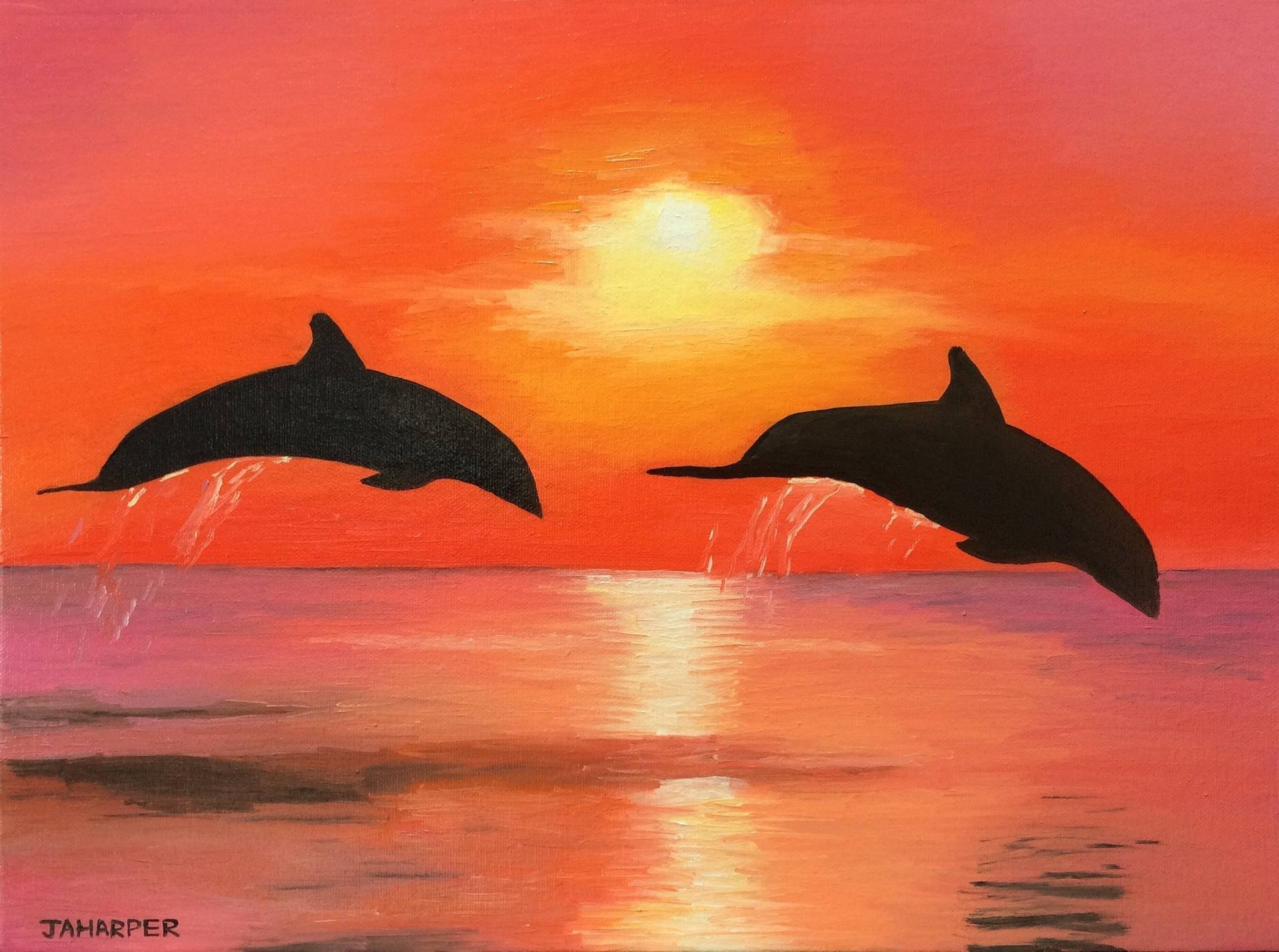 Дельфины на закате гуашью