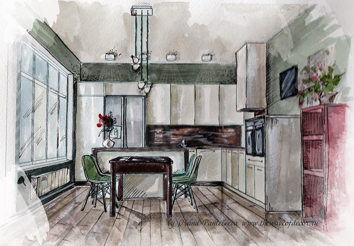 ![Интерьер кухни акварелью]()