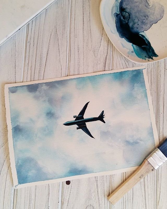 ![Самолет в небе акварель]()