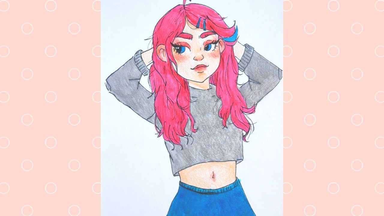 ![Рисунки для срисовки девушки с розовыми волосами]()