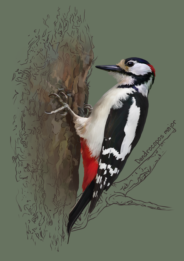 Представляем вам захватывающий рисунок большого пестрого дятла. Этот яркий и красочный рисунок позволяет окунуться в волшебный мир природы и насладиться красотой этой удивительной птицы. Большой пестрый дятел, известный своим потрясающим оперением, привлекает внимание своей яркостью и грациозностью. На данном рисунке мы можем увидеть его сложные рисунки на перьях, сочетающие разные оттенки черного, белого и ярких цветов. Размашистые движения крыльев и выразительный взгляд делают этот рисунок по-настоящему живописным. Он будет прекрасным украшением для любителей природы и животных, а также станет превосходным подарком для всех, кто ценит красоту и творчество.