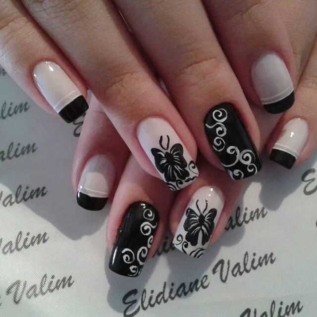 ![Маникюр черный с белыми цветами]()