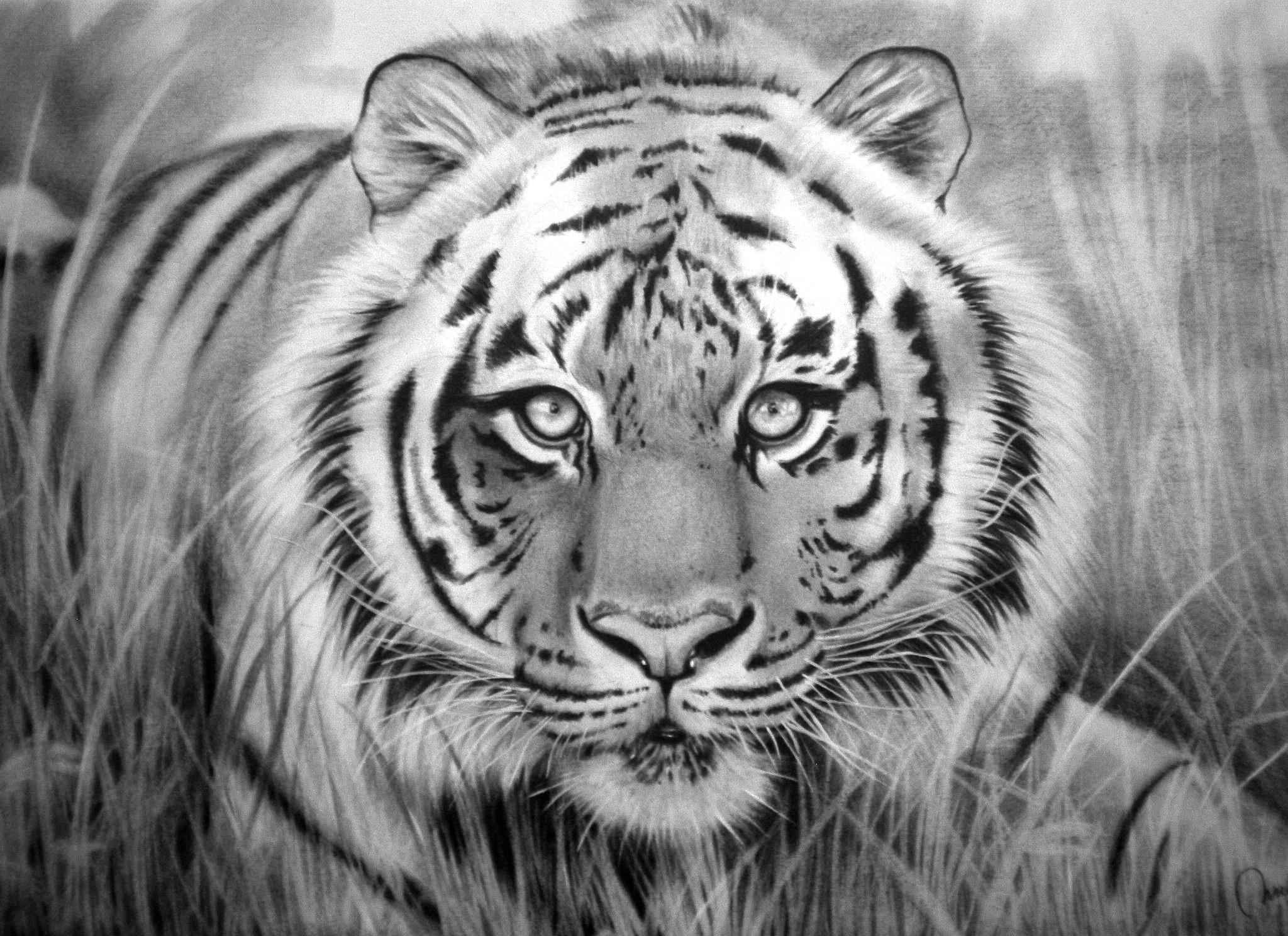 ![Рисунок тигра черно белый]()