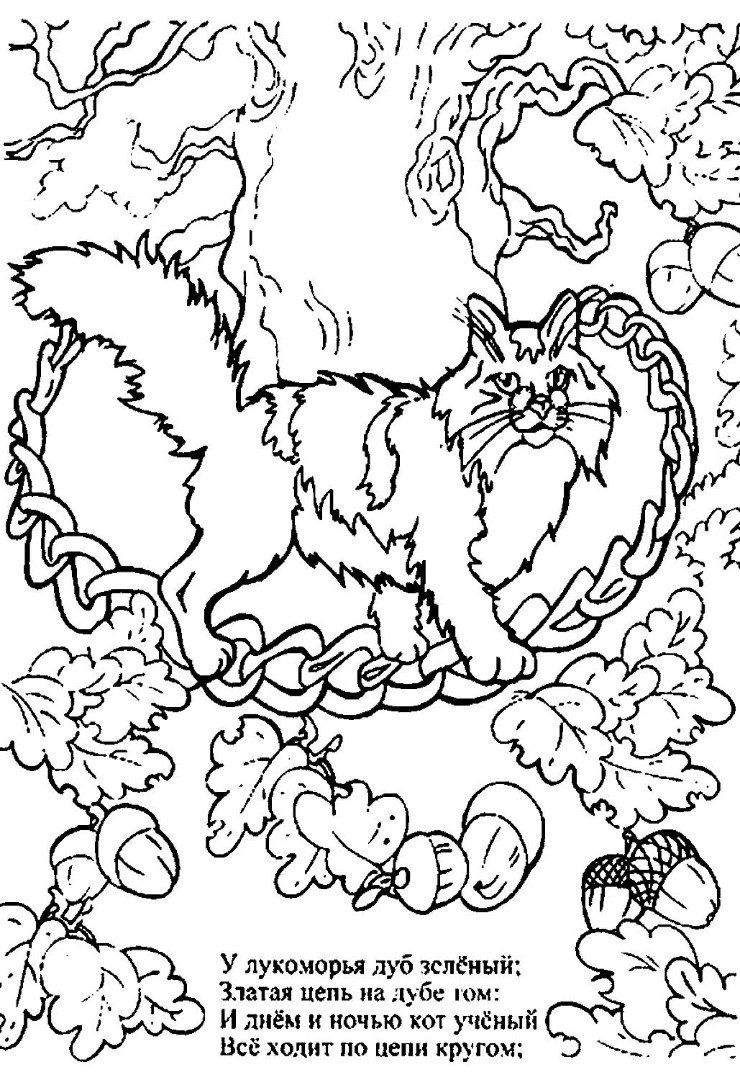 ![Раскраска Пушкина у Лукоморья дуб зеленый]()