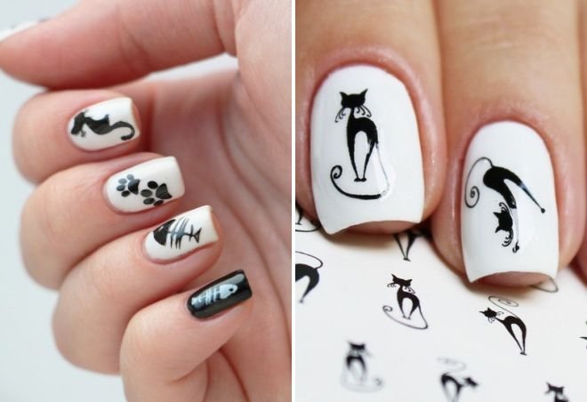 Черно белый маникюр с кошкой