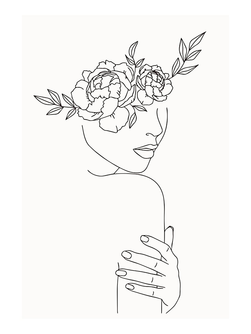 ![Эскиз одной линией женщина с цветами]()