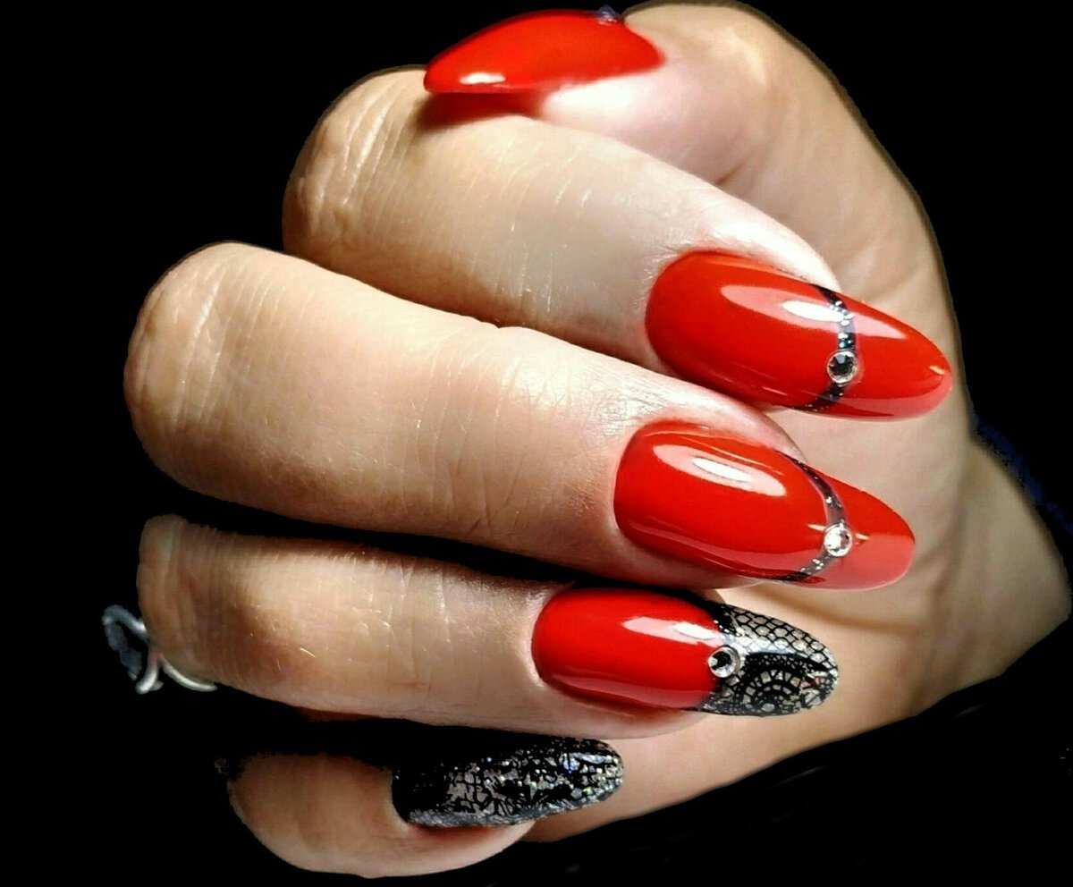 Красные ногти с черным кружевом