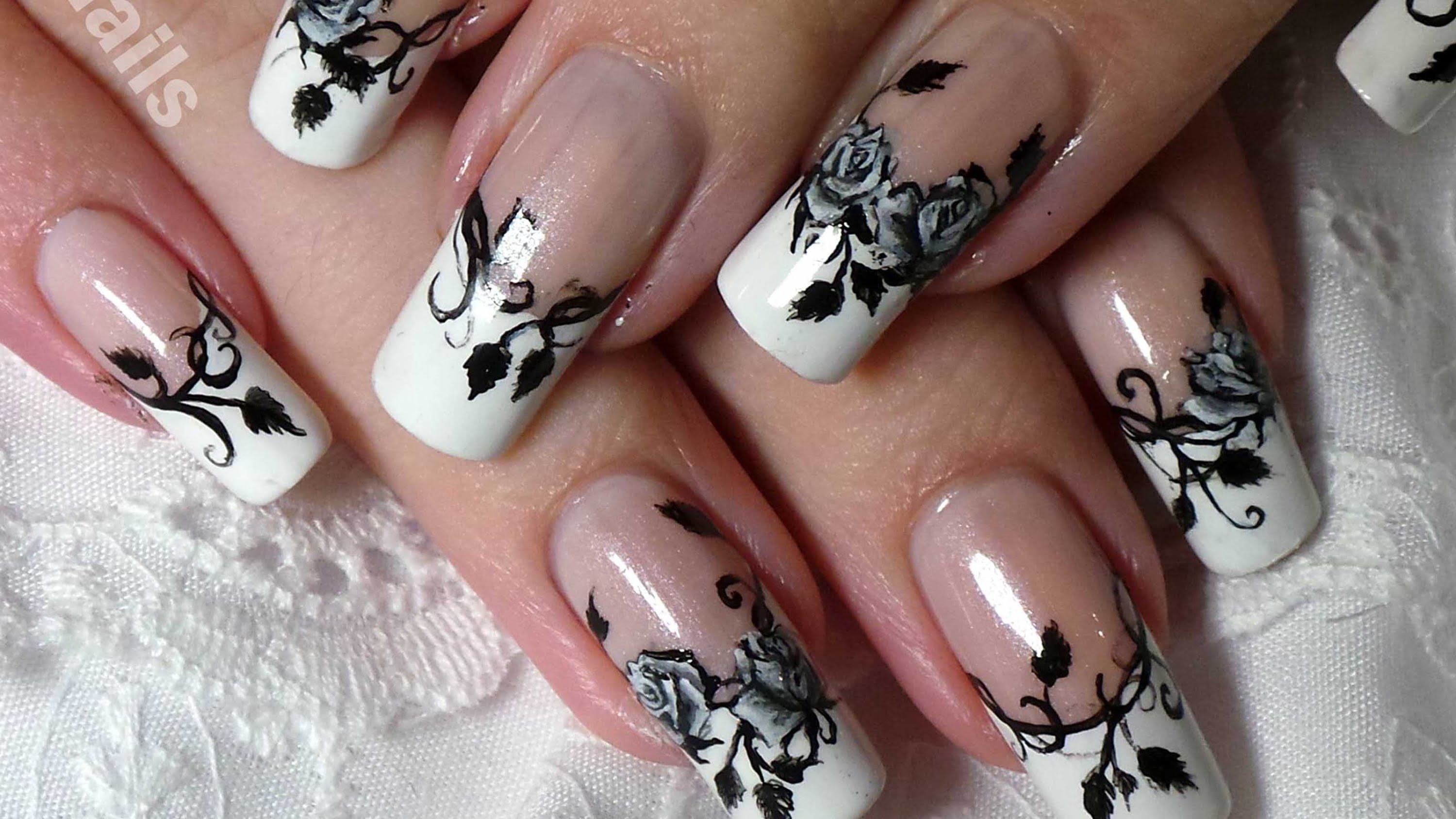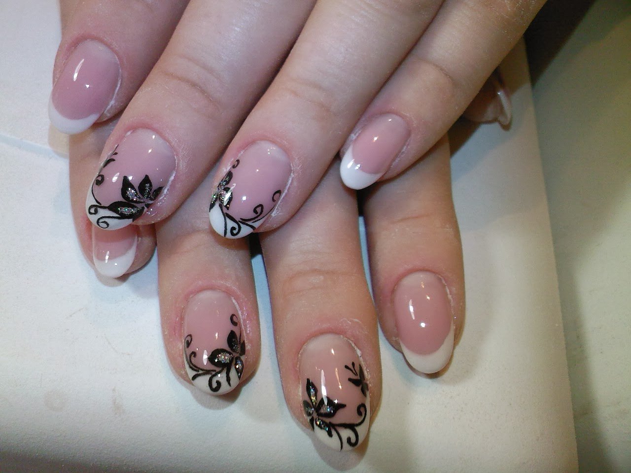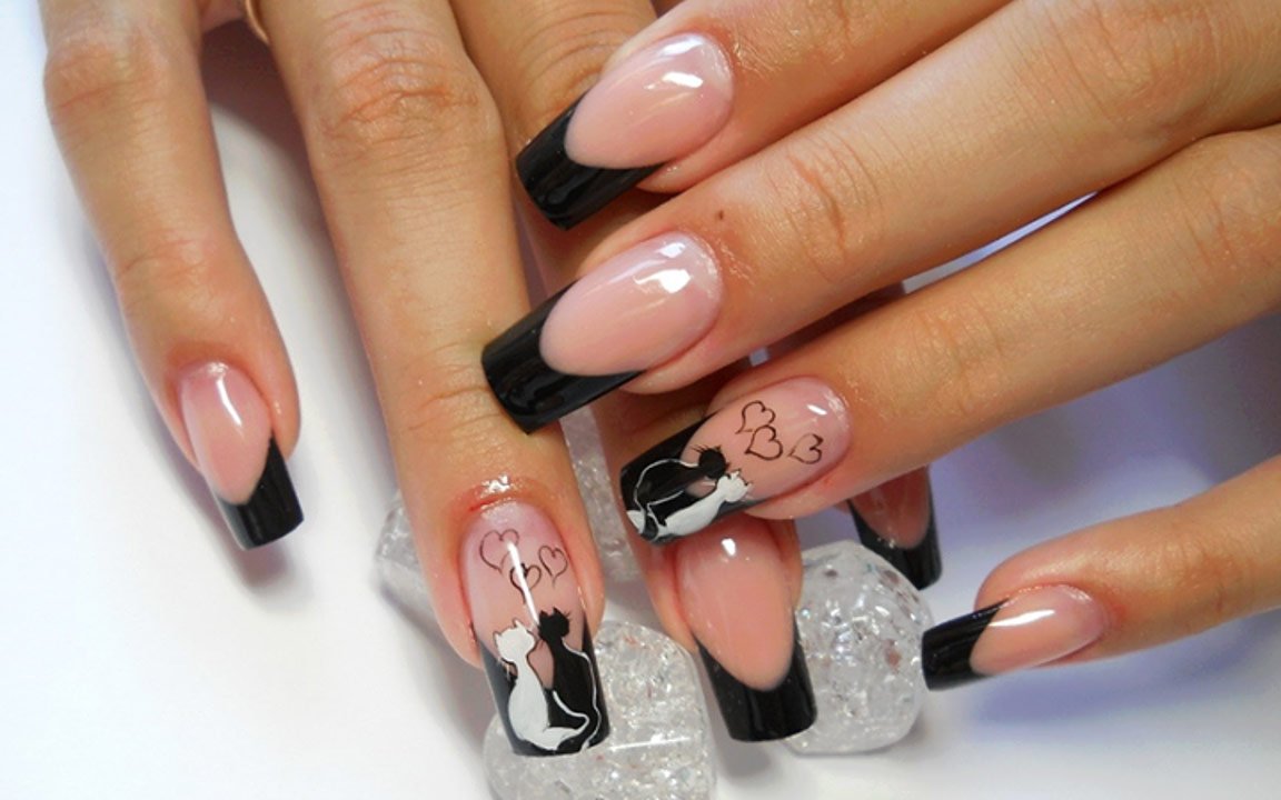 Чёрный дизайн ногтей на нарощенные ногти с рисунком