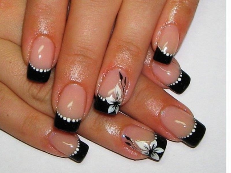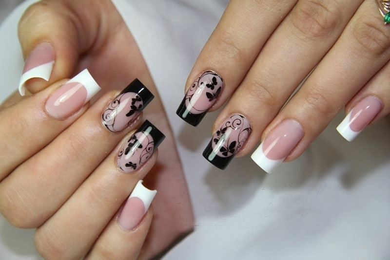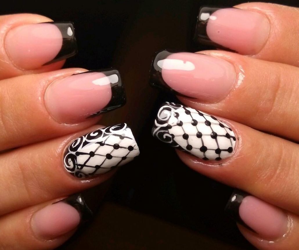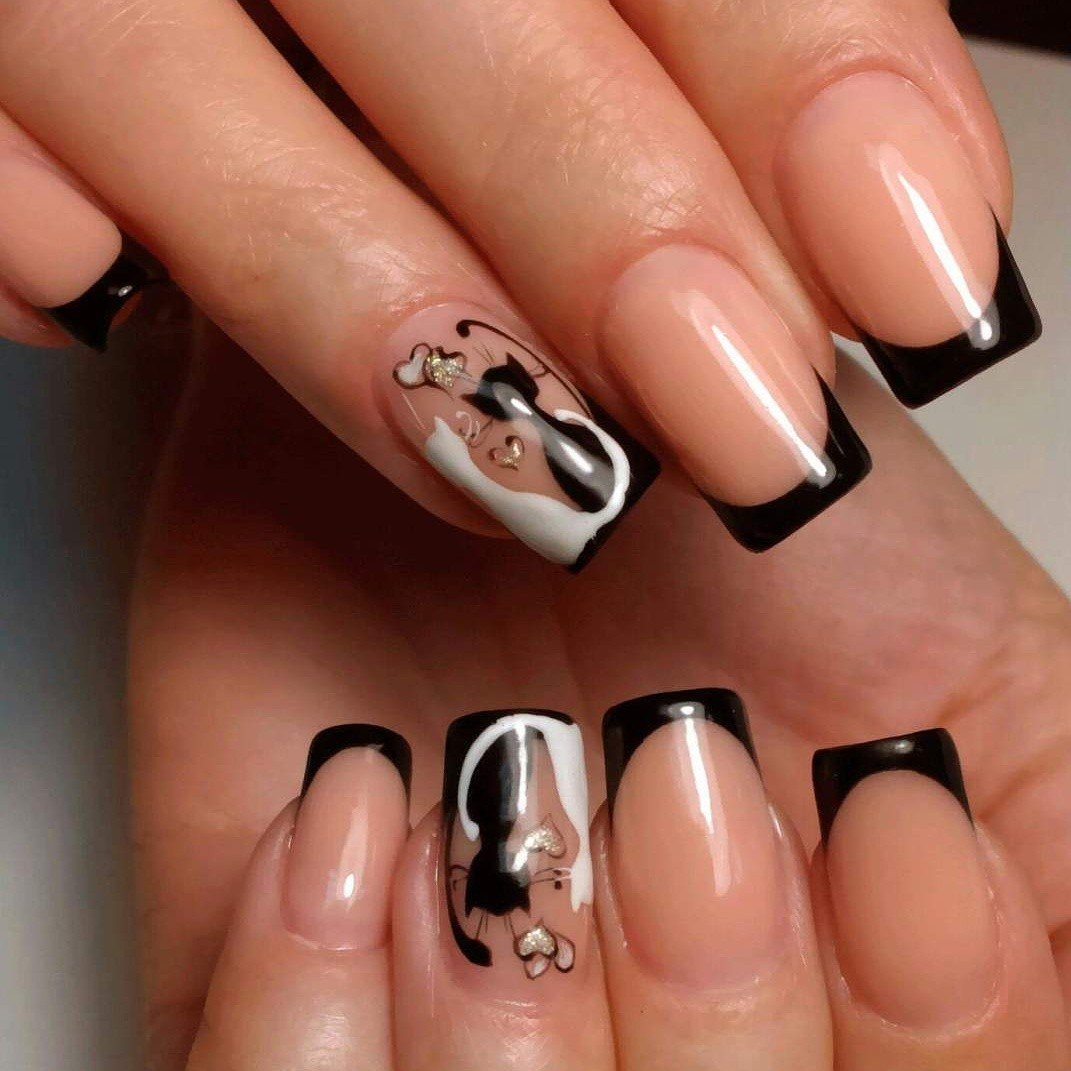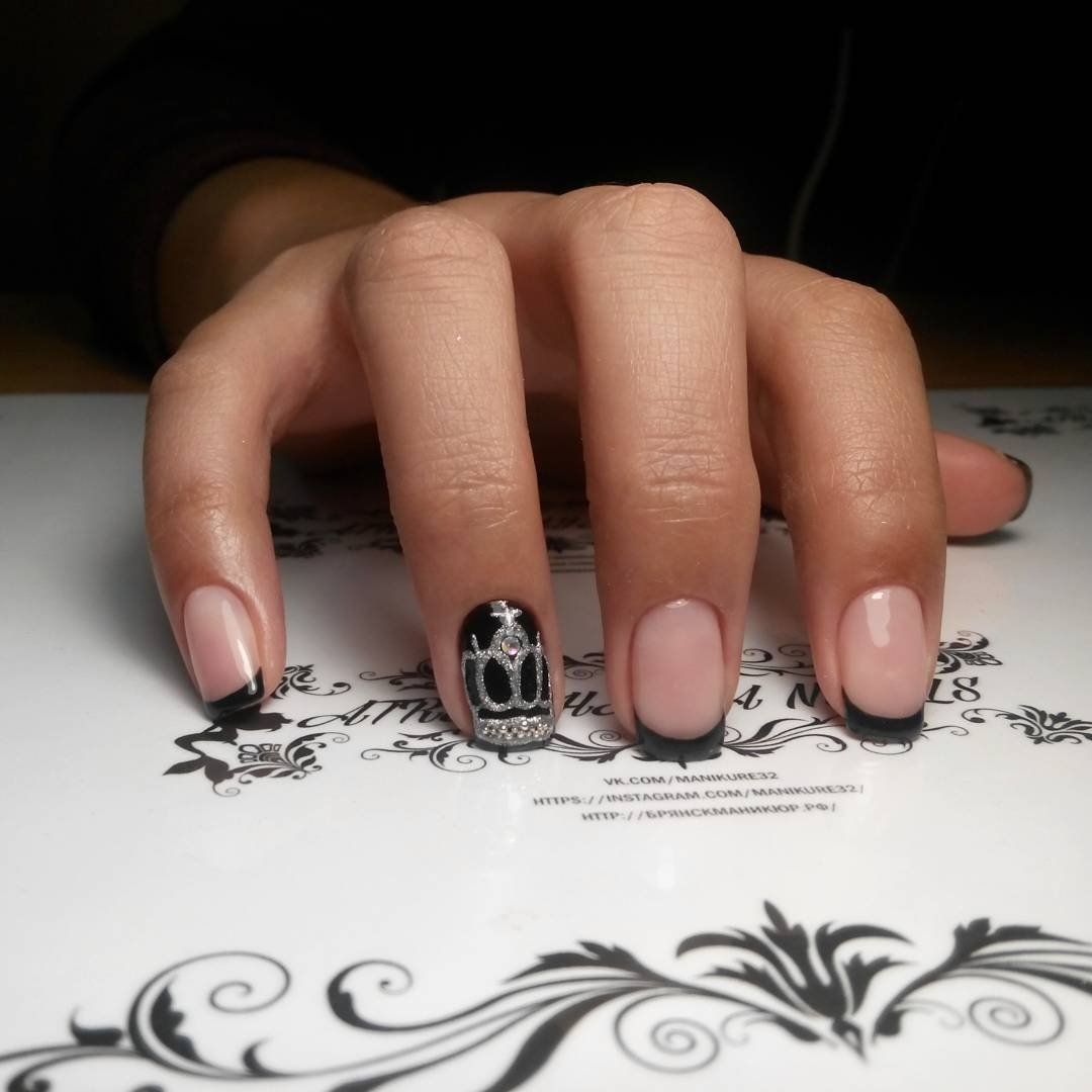 Маникюр квадрат френч черный с рисунком на безымянном пальце
