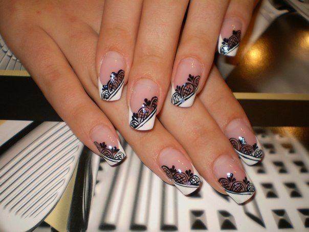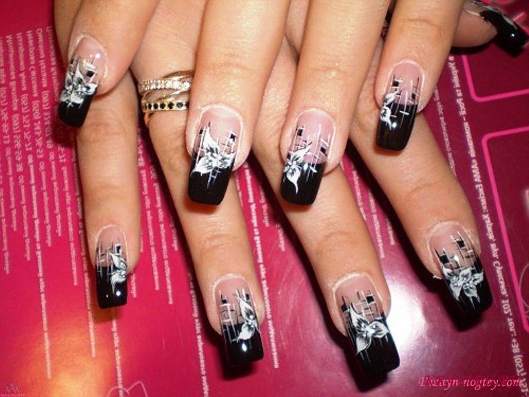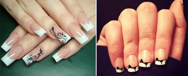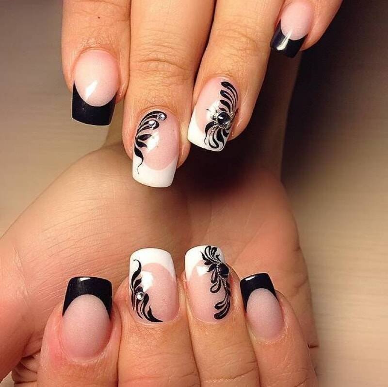 ![Маникюр квадрат френч черный с рисунком на безымянном пальце]()