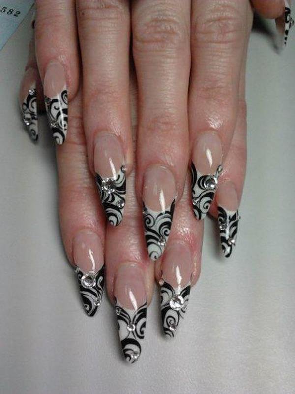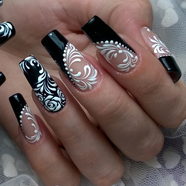 ![Чёрный дизайн ногтей на нарощенные ногти с рисунком]()