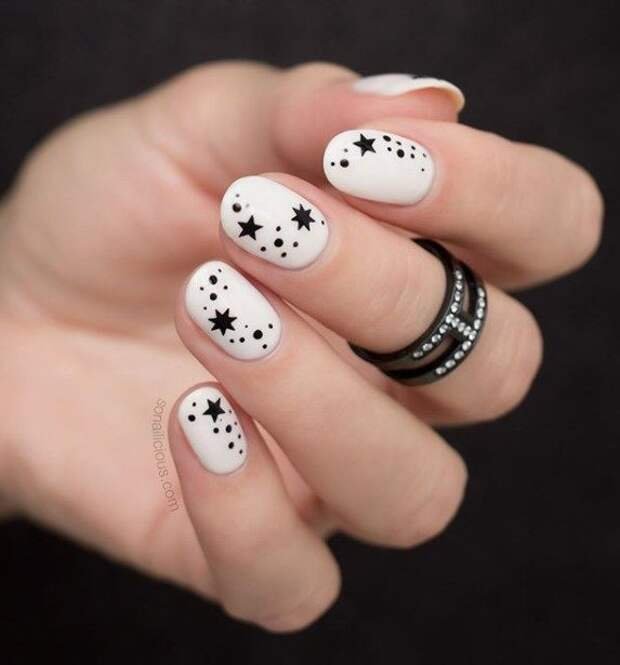 ![Черный маникюр с белыми звездами]()