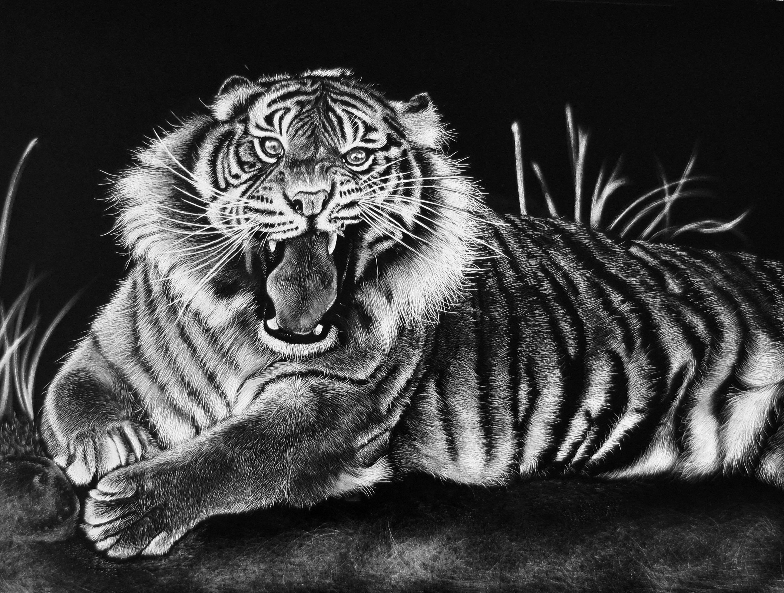 Впереди тебе открывается удивительный мир черно-белой графики, в котором царит невероятная энергия и мощь. Рисунок "Черно-белый тигренок" – это не просто изображение животного, это настоящий художественный шедевр, который заставляет замирать сердце. Каждая черная полоса, каждая белая полоса на его шкуре созданы с любовью и профессионализмом. Он воплощает в себе дикую красоту природы и демонстрирует тигровую силу и грацию. Этот рисунок перенесет тебя в джунгли, где ты сможешь почувствовать настоящую магию дикой природы и восхититься ее обитателями.