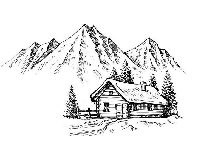 ![Дом в горах карандашом]()