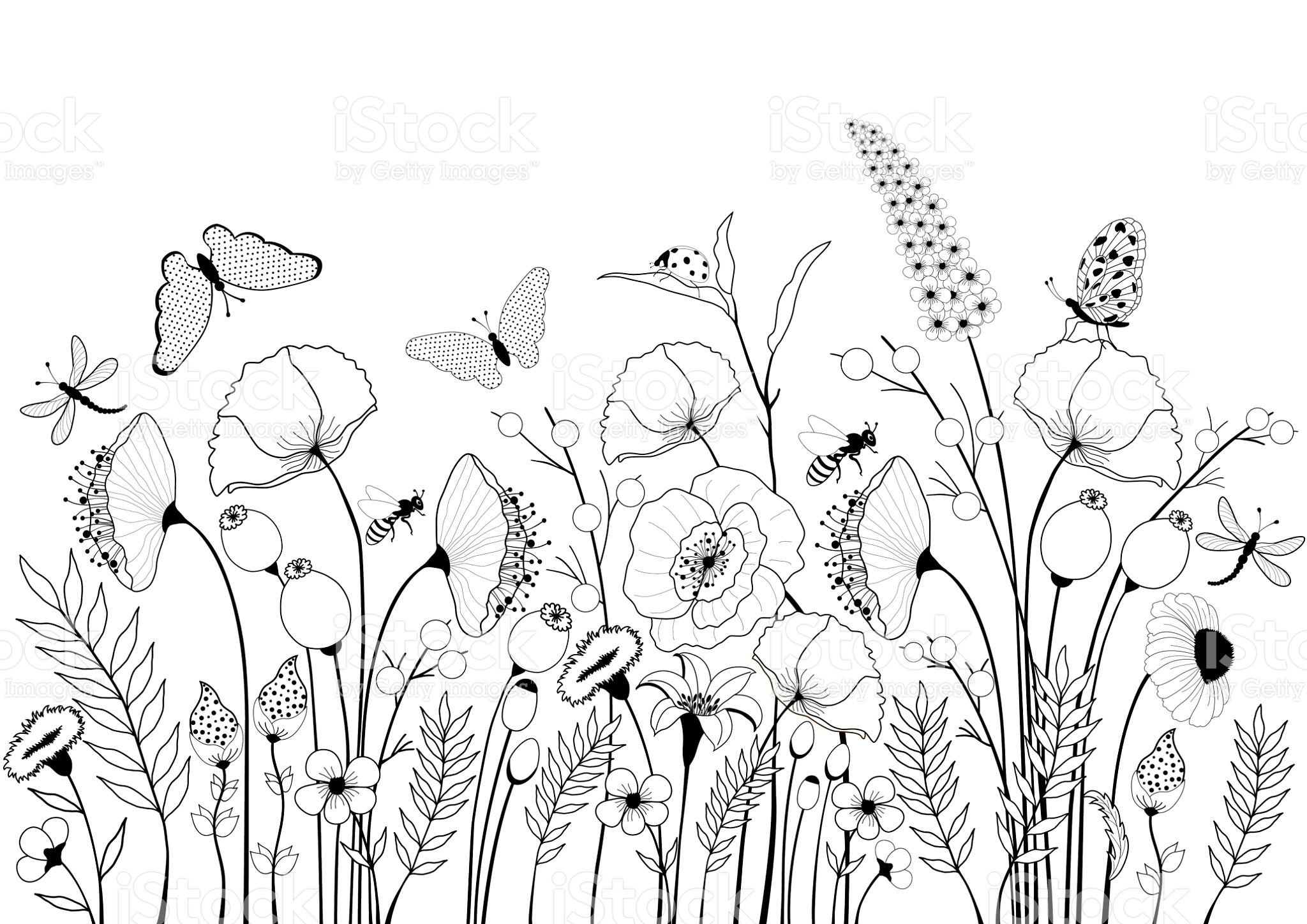 ![Раскраска луг с цветами]()