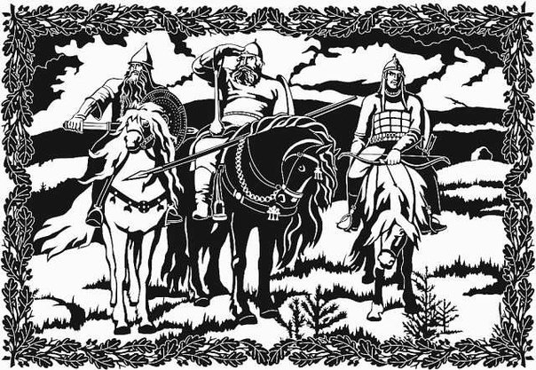 ![Раскраска три богатыря Алеша, Илья,Добрыня]()