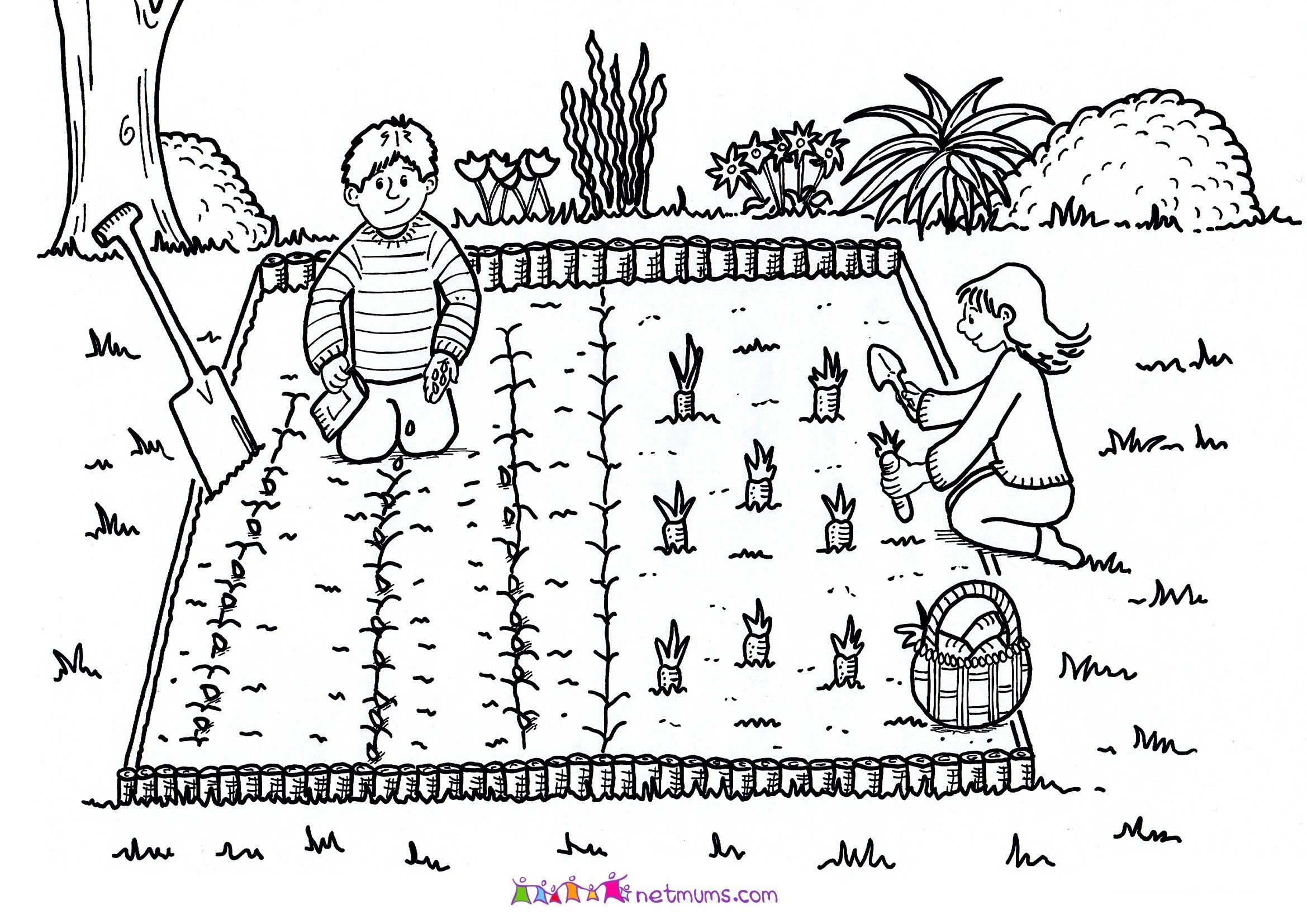 ![Огород раскраска для детей грядки]()
