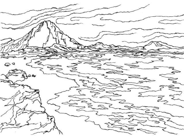 ![Горы и озеро раскраска]()