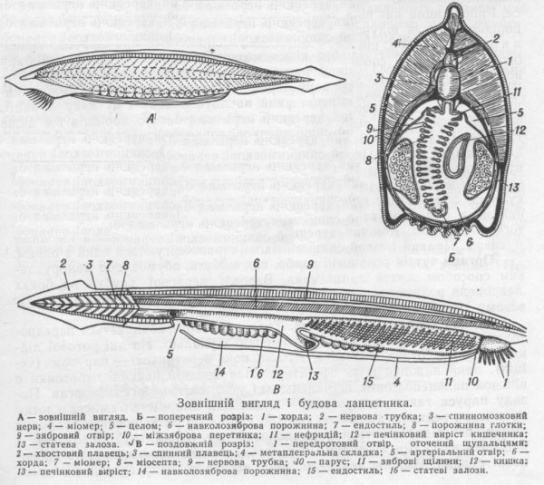 ![Внешнее и внутреннее строение ланцетника]()