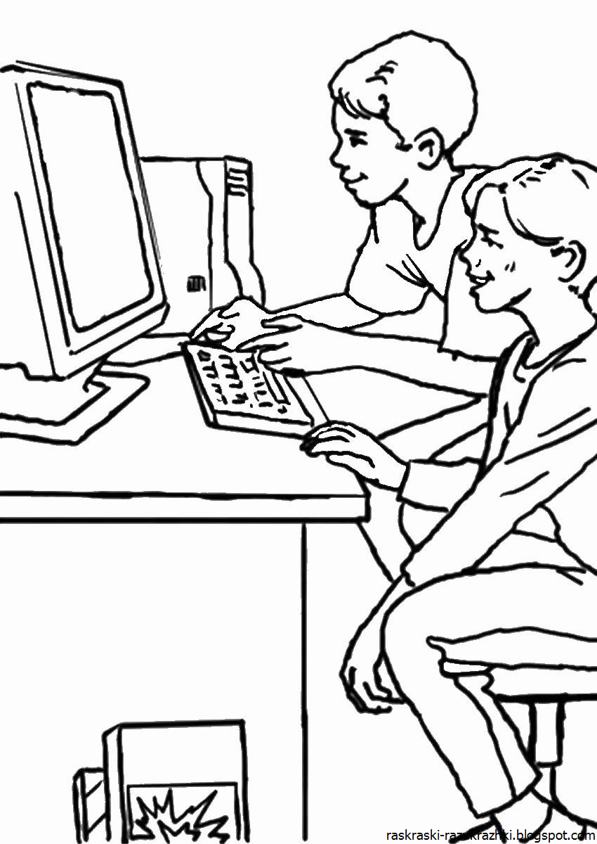 ![Ребенок за компьютером раскраска]()