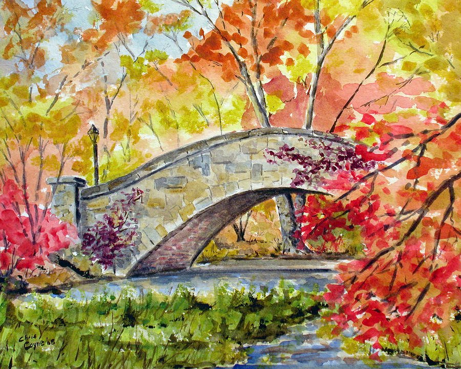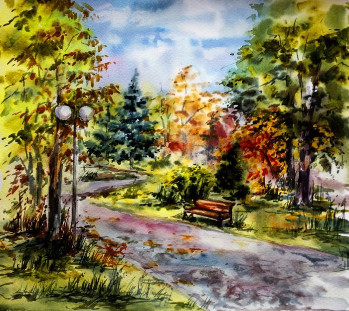 Парк осенью акварель