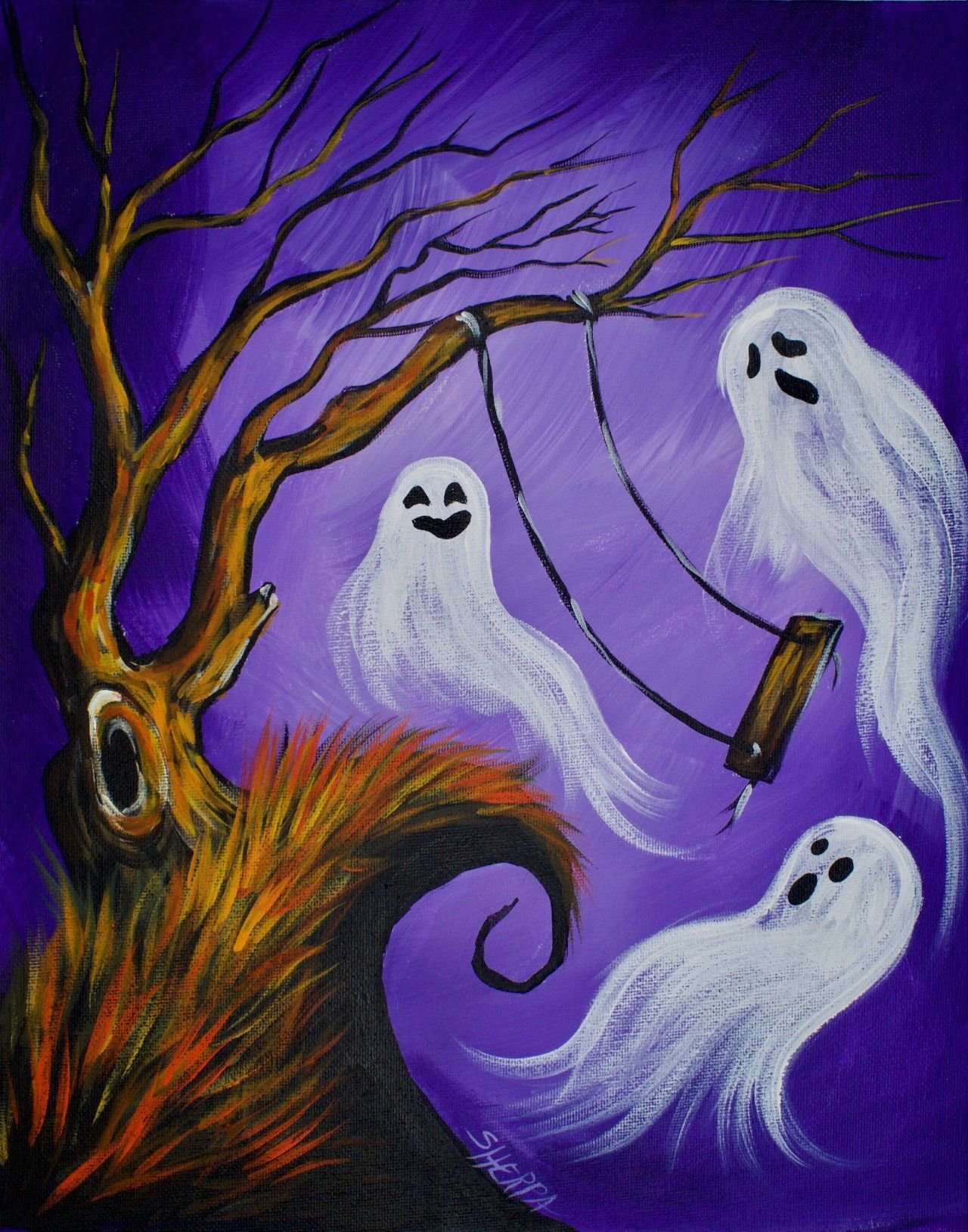 Три призрака Ручеек фонарик травка тыква гуашью