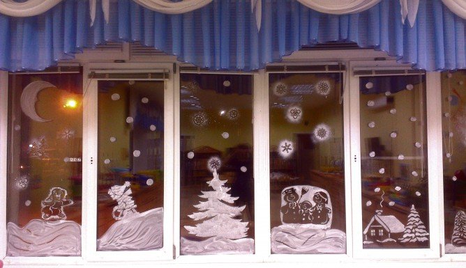 ![Украшение окон в детском саду гуашью]()