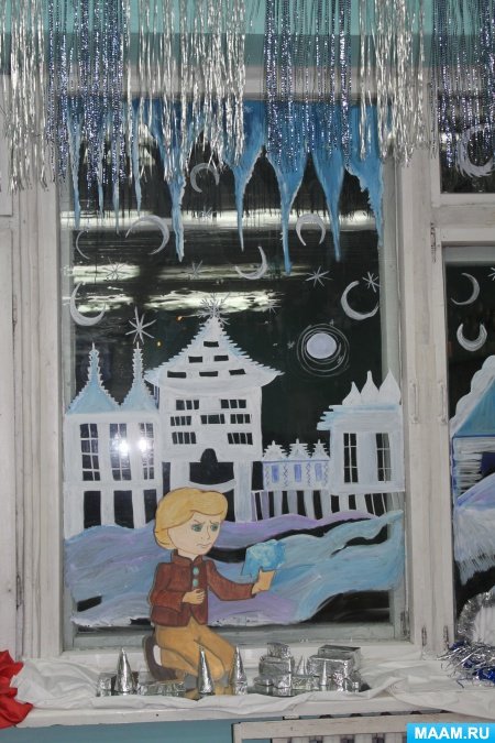 ![Новогодняя сказка на окне в детском саду]()